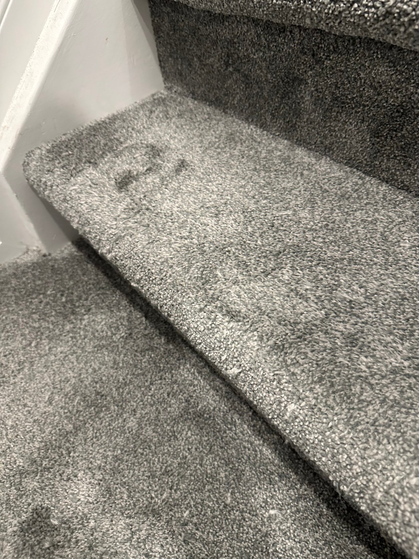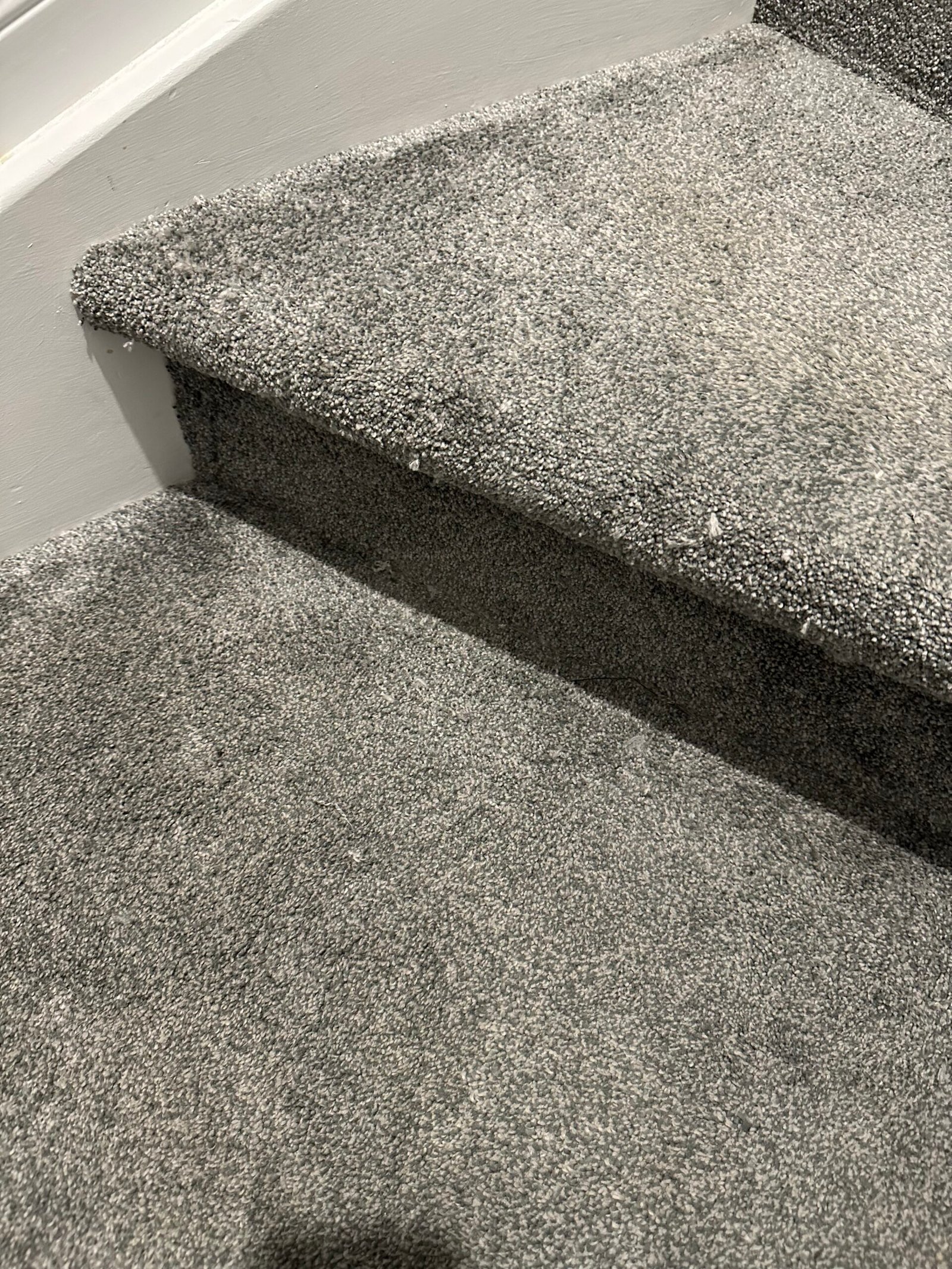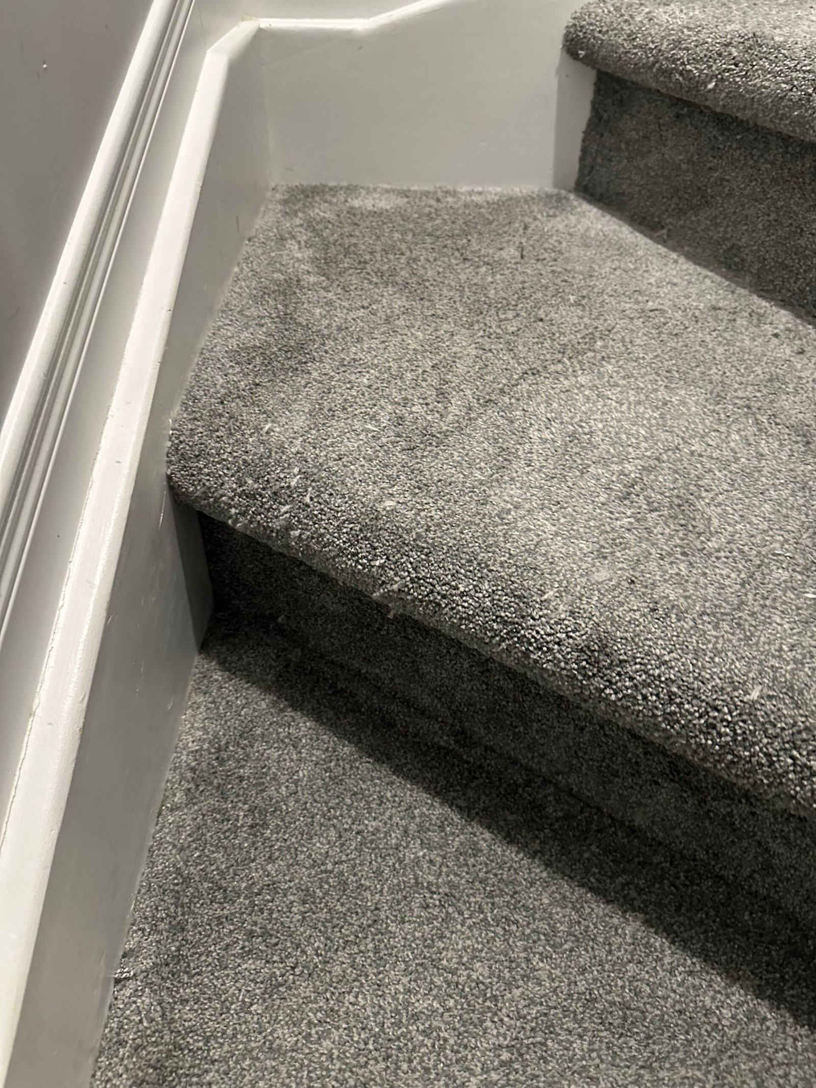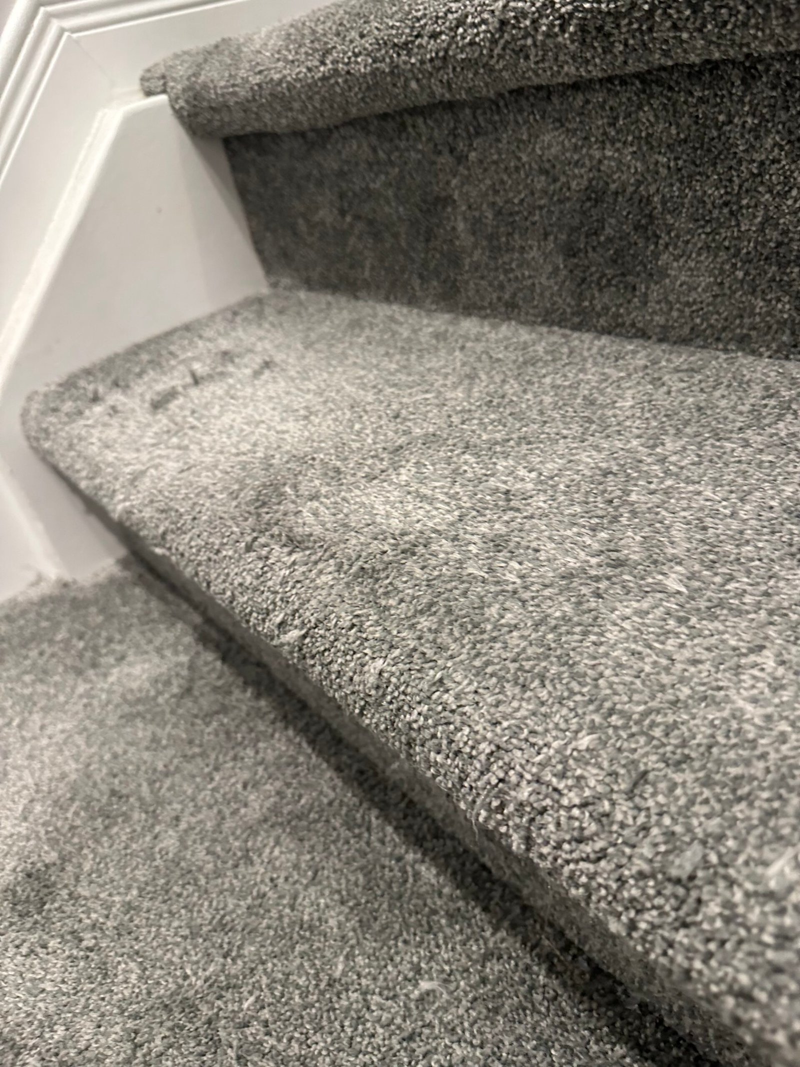 Over time, carpet on stairs can loosen, ripple, or fray along the edges — especially in high-traffic areas. This one needed precise trimming and tightening to restore a clean, seamless look.